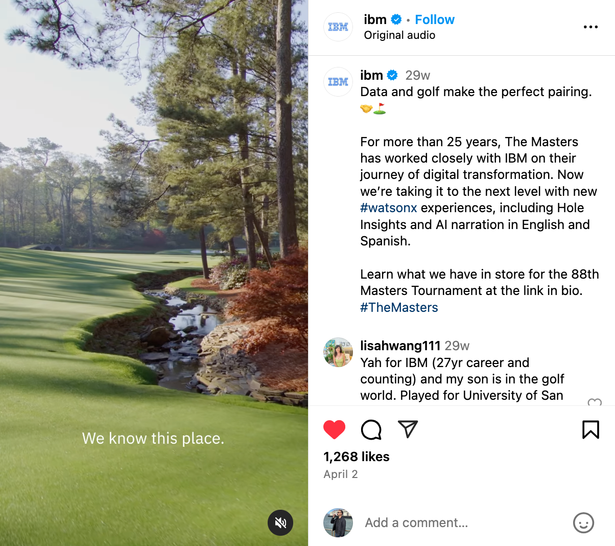 As a key contributor to IBM's partnership with the Masters Tournament, Spotlight Social Media led digital campaigns that boosted brand visibility and engagement. Our expertise in paid social media strategy and content ideation resulted in a 170% increase in traffic to IBM.com/Masters through targeted Instagram ads.